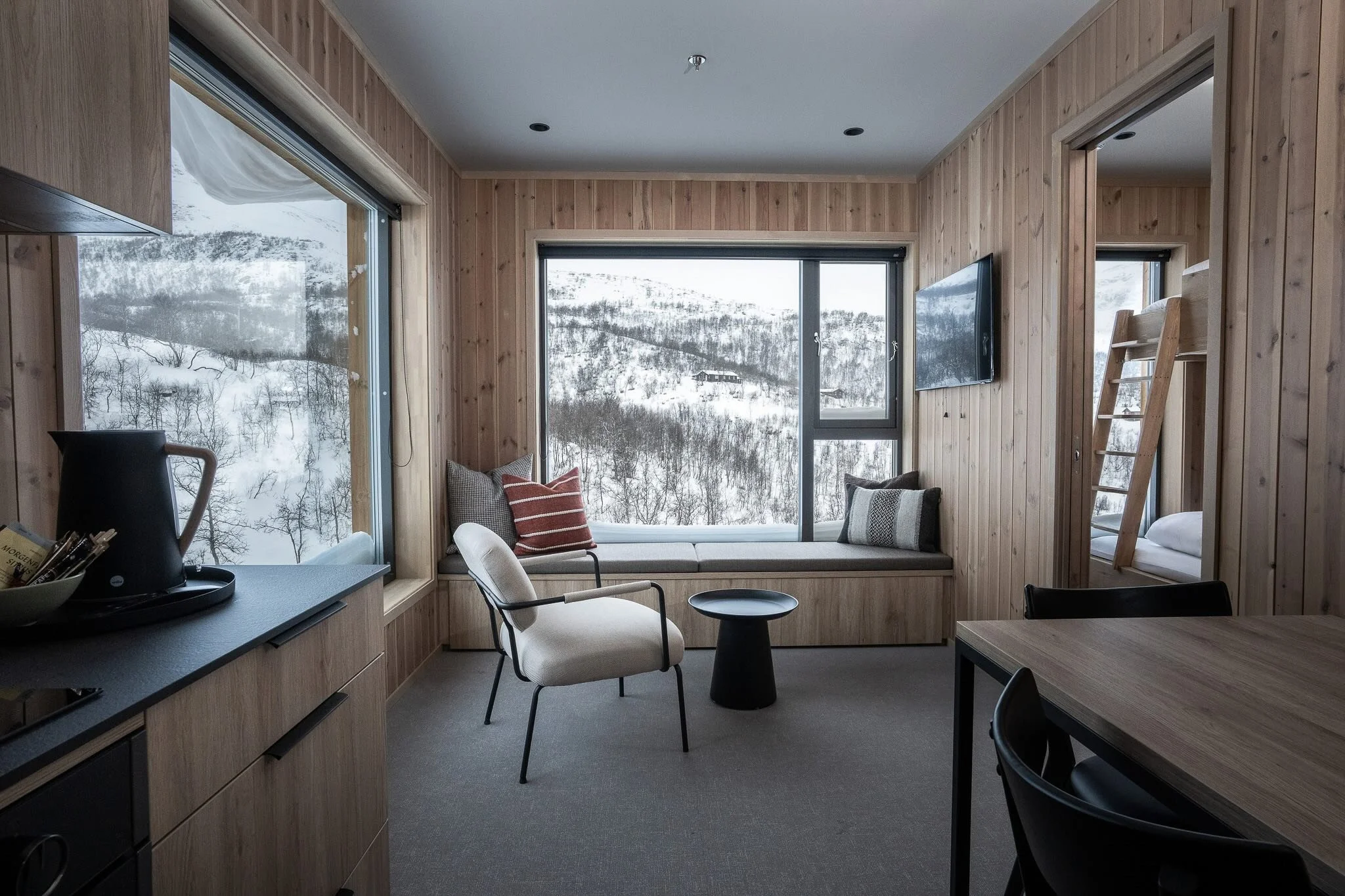 Your home for the week is a cosy mountain lodge. Twin and private rooms with private facilities, that spectacular riverside sauna, and a yoga space with mountain views. It's comfortable, cosy, and positioned perfectly for accessing the cross-country trail network.