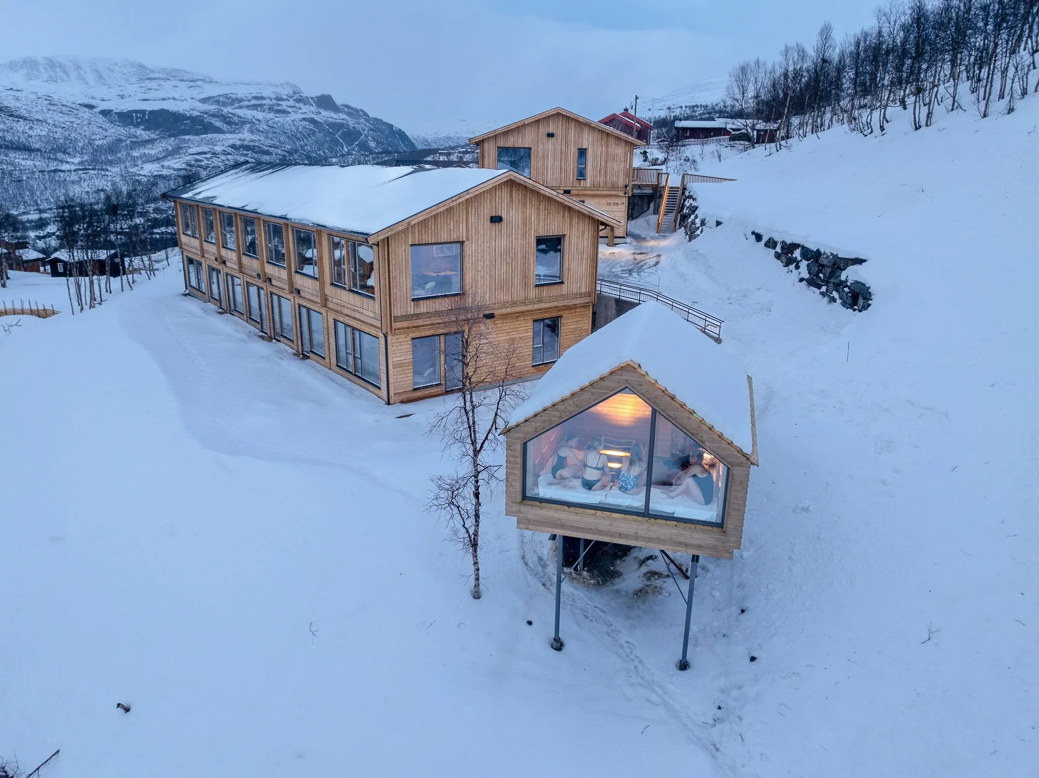Stay at a modern lodge hotel with a spectacular riverside sauna that hangs over the Begna River. Three-course dinners featuring local mountain ingredients, small groups, and yoga sessions with incredible views. Everything's arranged so you can focus on learning and exploring.